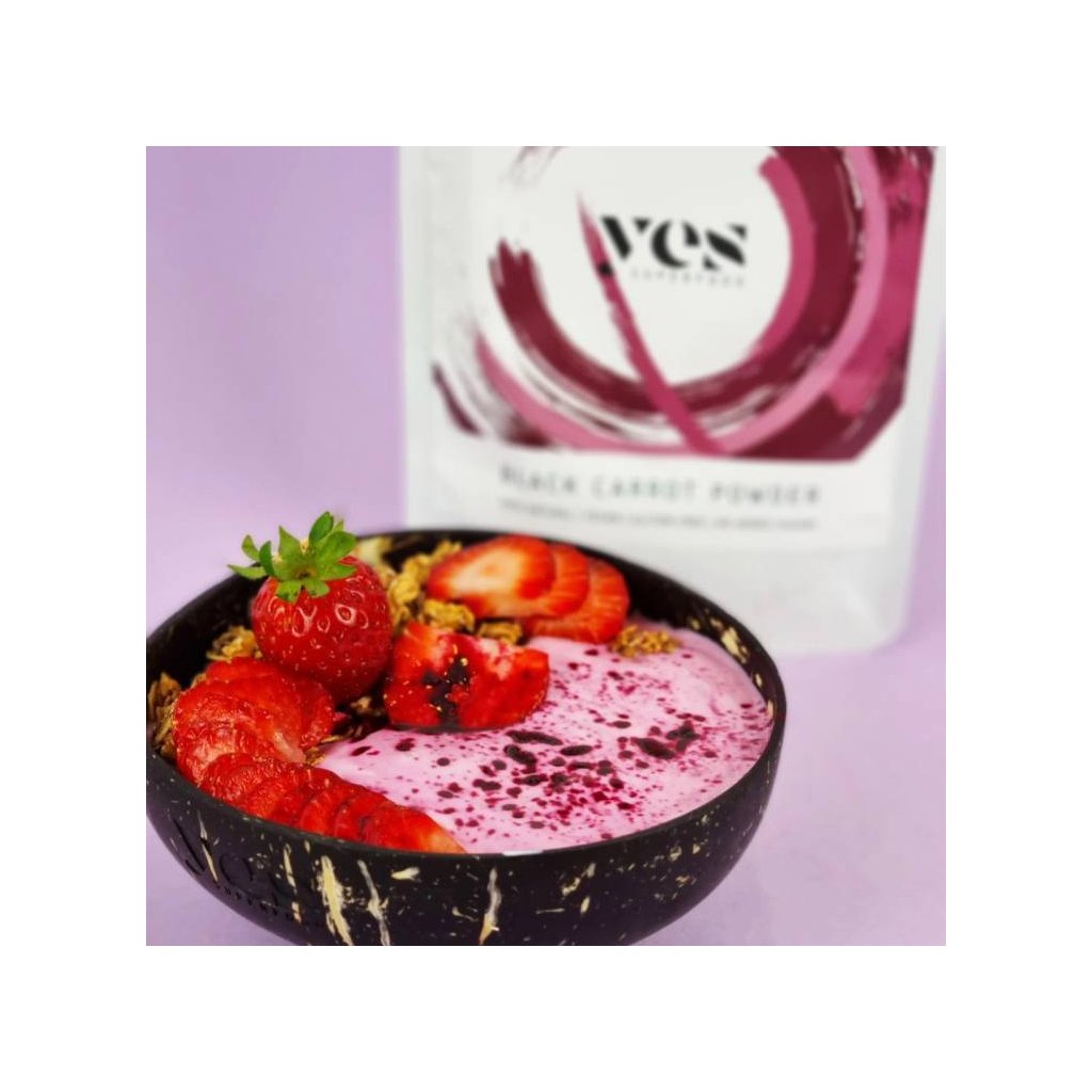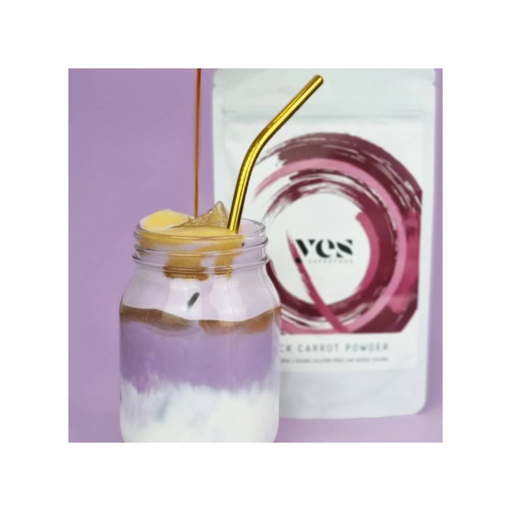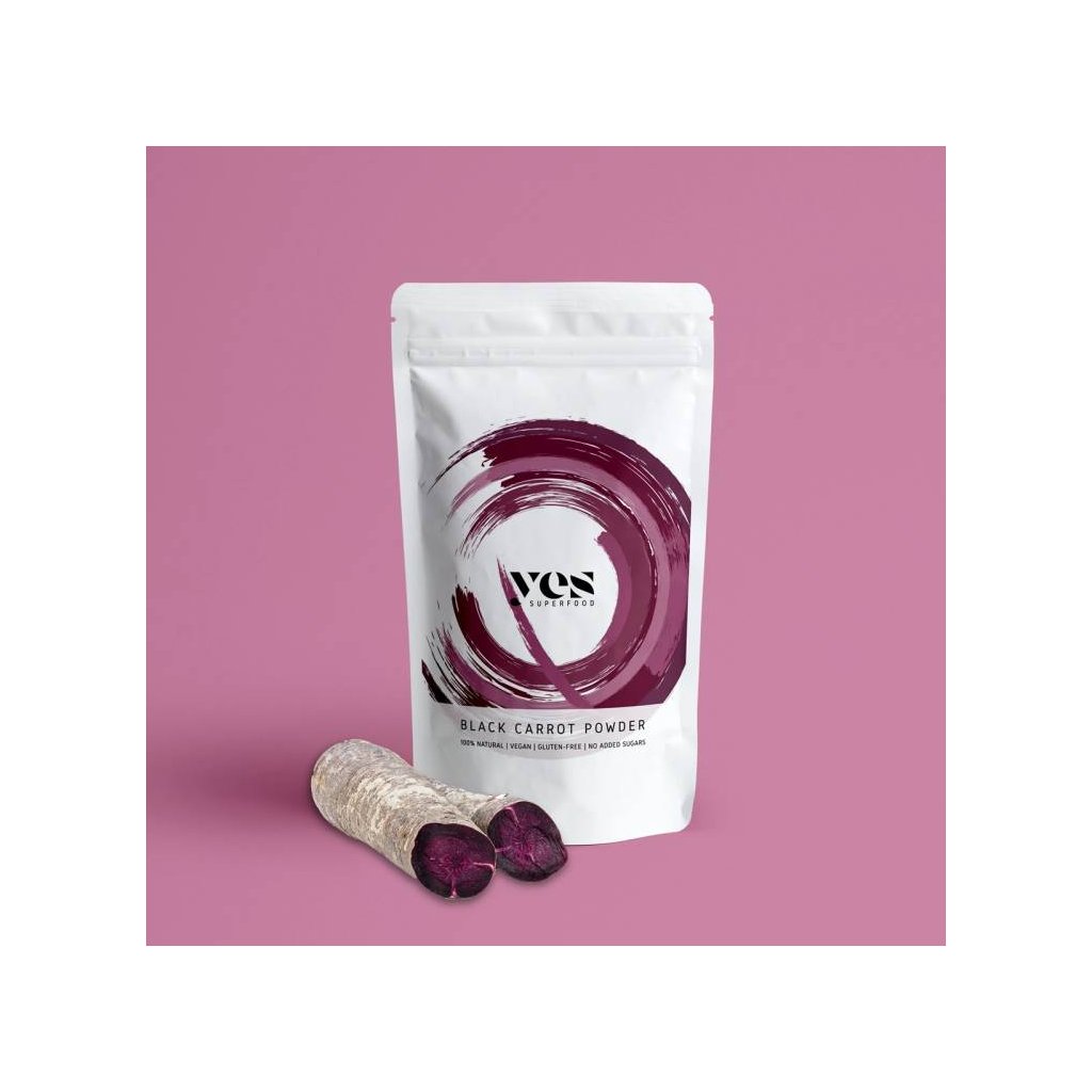 Jedno balení obsahuje 80 gramů prášku z černé mrkve, což je doporučená denní dávka po dobu cca 40 dnů, pokud se konzumuje jako doplněk stravy. Náš prášek z černé mrkve lze použít i jako přírodní potravinářské barvivo, v závislosti na použitém množství s ním můžete dosáhnout růžových, fialových a kaštanových odstínů.Superpotravinový prášek z černé mrkve Yes Superfood je vyroben ze 100% černé mrkve a neobsahuje žádná barviva, konzervanty ani jiné přísady. Používání superpotravinových prášků je opravdu snadné a můžete je míchat nekonečně mnohokrát! Začněte s 1/2 - 1 čajovou lžičkou superpotravinového prášku a přidejte více, pokud chcete zářivější barvu! Zamíchejte je do smoothie! Vylepšete si s nimi proteinový koktejl! Připravte si s nimi zábavné superpotravinové latté! Zamíchejte je do jogurtu, ovesných vloček nebo chia pudinků! Ozdobte jimi pečivo a dezerty! Černá mrkev je spojována s následujícími superschopnostmi: Může posílit váš imunitní systém a učinit vás odolnějšími vůči nemocem. Díky vysokému obsahu antioxidantů může bojovat proti volným radikálům. Může snižovat hladinu cholesterolu. Může vám pomoci dosáhnout zdravé a na živiny bohaté stravy. Může zabránit předčasnému stárnutí. Může mít protizánětlivý účinek. Rozmanité barvy a spousta zdravotních benefitůNáš superpotravinový prášek z černé mrkve má tmavě kaštanově fialovou barvu a můžete dosáhnout různých odstínů jeho smícháním s různými potravinami. Jeho sladká chuť připomíná červenou řepu a můžete s ním vylepšit sladká i slaná jídla! Víc než jen obyčejná mrkevNáš nejnovější superpotravinový prášek je speciální barevná bomba s extra vysokým obsahem antioxidantů. Černá mrkev se od běžné mrkve liší nejen barvou, ale také svým obsahem živin převyšuje svou běžnou příbuznou. Nutriční hodnoty ve 100 g: energie 1623 kJ/388 kcal, tuky 1 g (z toho nasycené 0 g), sacharidy 95 g (z toho cukry 10 g), bílkoviny 1 g, sůl 0,26 gDoplňkové parametry