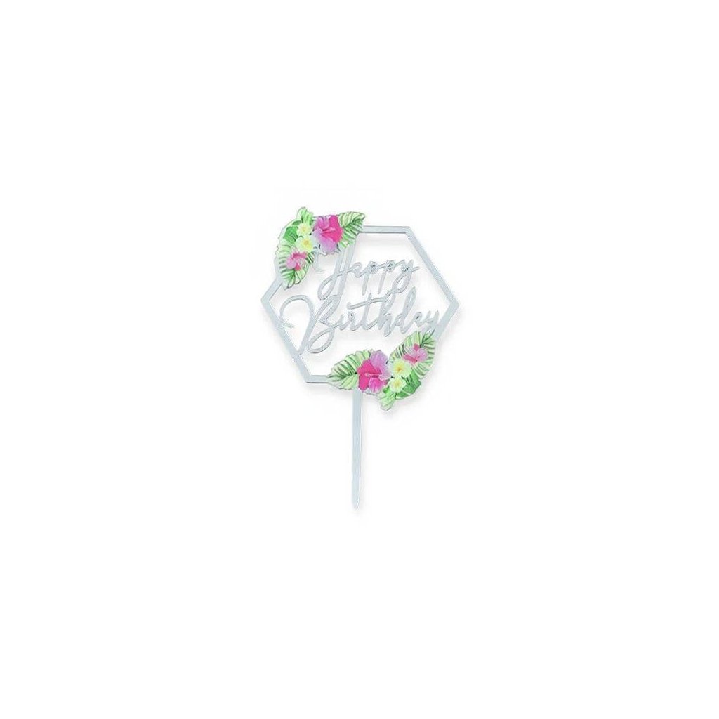 Zapichovací dekorace na dort stříbrná Happy Birthday v rámečku s květinami ♡