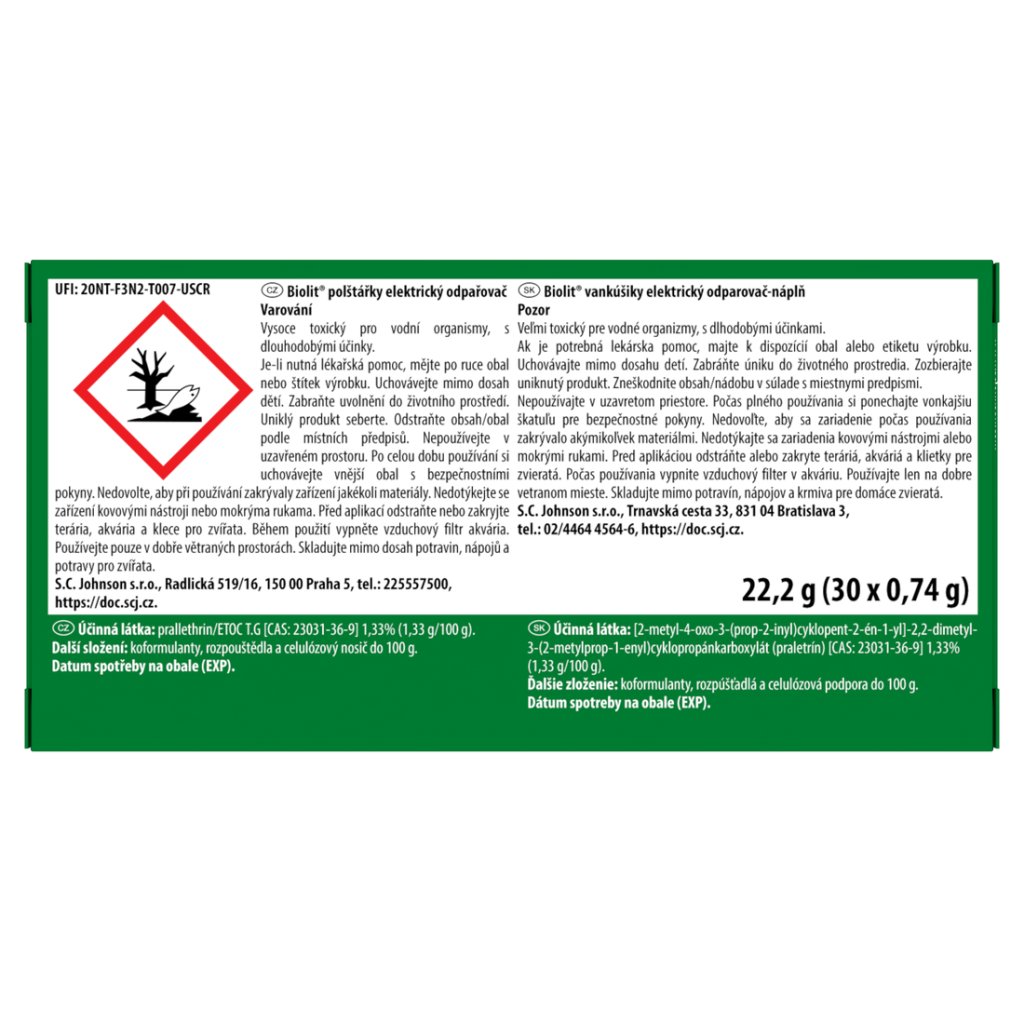 | Skladování: | Uchovávejte mimo přímé sluneční záření a skladujte při teplotách do 25 °C., skladujte mimo dosah dětí |
