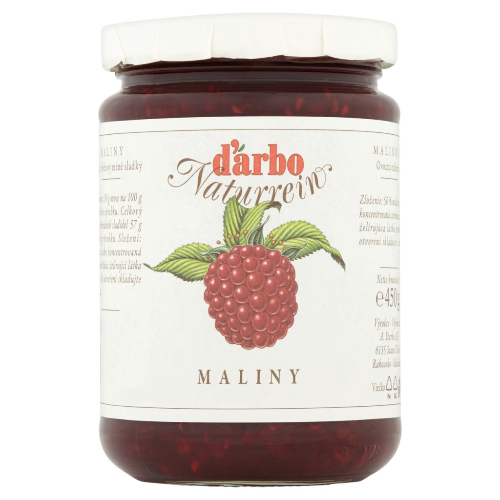 - Vyrobeno z 50 g ovoce na 100 g konečného výrobku. Celkový obsah přírodních sladidel 57 g ve 100 g výrobku. Složení: maliny, cukr, koncentrovaná citrónová šťáva, želírující látka pektin