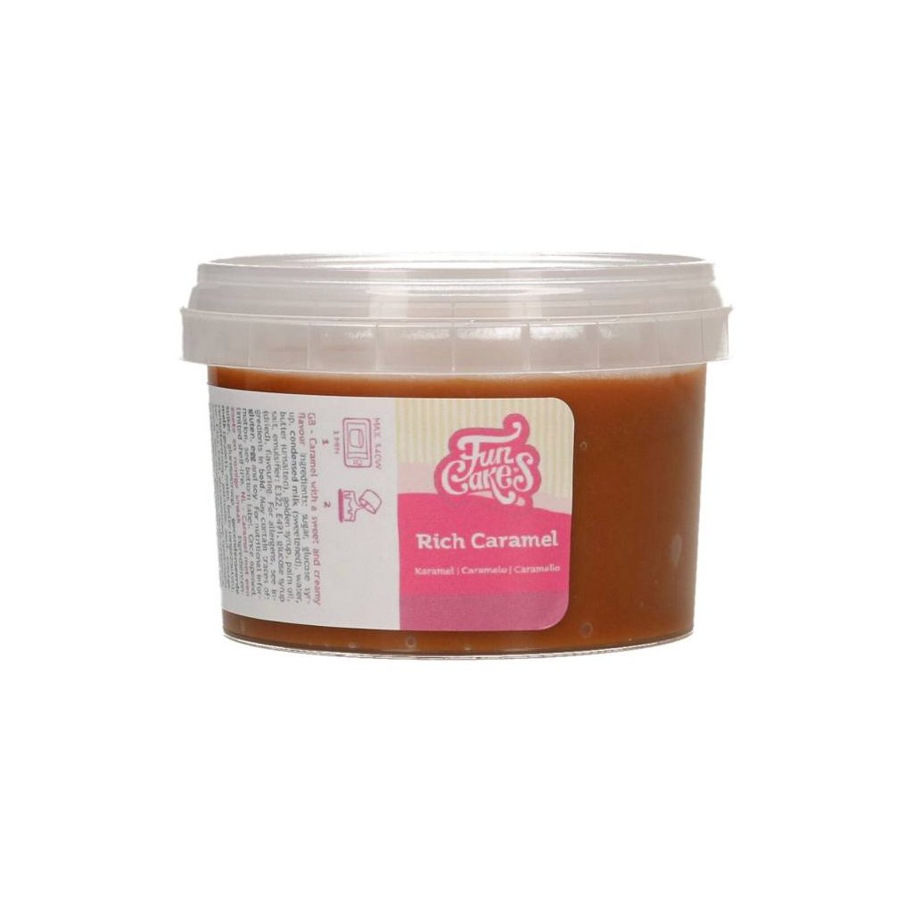 FunCakes karamel lze použít jako polevu, drip, náplň nebo ochucovací pastu do zmrzlin a krémů. Ideální na dorty, donuty, cupcakes a mnoho dalších. Složení: cukr, glukózový sirup, slazené kondenzované mléko, voda, máslo (nesolené), zlatý siup, palmový olej, sůl, emulgátor E322, E491, glukózový sirup (sušený), aroma. Může obsahovat stopy vajec a sóji. Nutriční hodnoty ve 100 g: energie 1619 kJ/385 kcal, tuky 17,3 g (z toho nasycené 10,3 g), sacharidy 69,5 g (z toho cukry 57,6 g), bílkoviny 1 g, sůl 0,5 gDoplňkové parametry