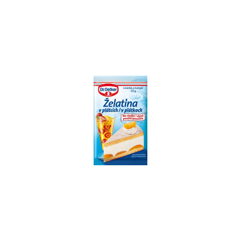 - Návod na použití: 1. Příprava krémů (smetanových, jogurtových, tvarohových apod.), náplní, dezertů z ovocné šťávy a vaječné tlačenky z želatiny. Do menšího hrnce dáme 4-5 polévkových lžic vody přidáme plátky želatiny a necháme asi 10 minut nabobtnat. Za stálého míchání zahřejeme (nevaříme) až do úplného rozpuštění želatiny. Okamžitě přidáme 2 polévkové lžíce krému / ovocné šťávy / směsi na tlačenku / a metličkou nebo vařečkou zamícháme. Vmícháme zpět do krému / ovocné šťávy / směsi na tlačenku. Dále zpracujeme podle konkrétního receptu. 2. Příprava rosolů a aspiků Plátky želatiny zalijeme 0,5 l studené vody nebo nálevu a necháme asi 10 min. nabobtnat. Za stálého míchání zahřejeme (nevaříme) až do úplného rozpuštění želatiny. Želatinu necháme mírně vychladnout a ještě vlažnou ji použijeme podle konkrétního receptu. Tip: K přípravě slaných pokrmů můžeme k rozpuštění želatiny použít nálev z 0,5 l vody, velké cibule, bobkového listu, celého nového koření a pepře - necháme přejít varem. Dochutíme octem, solí, cukrem a použijeme k rozpuštění želatiny.