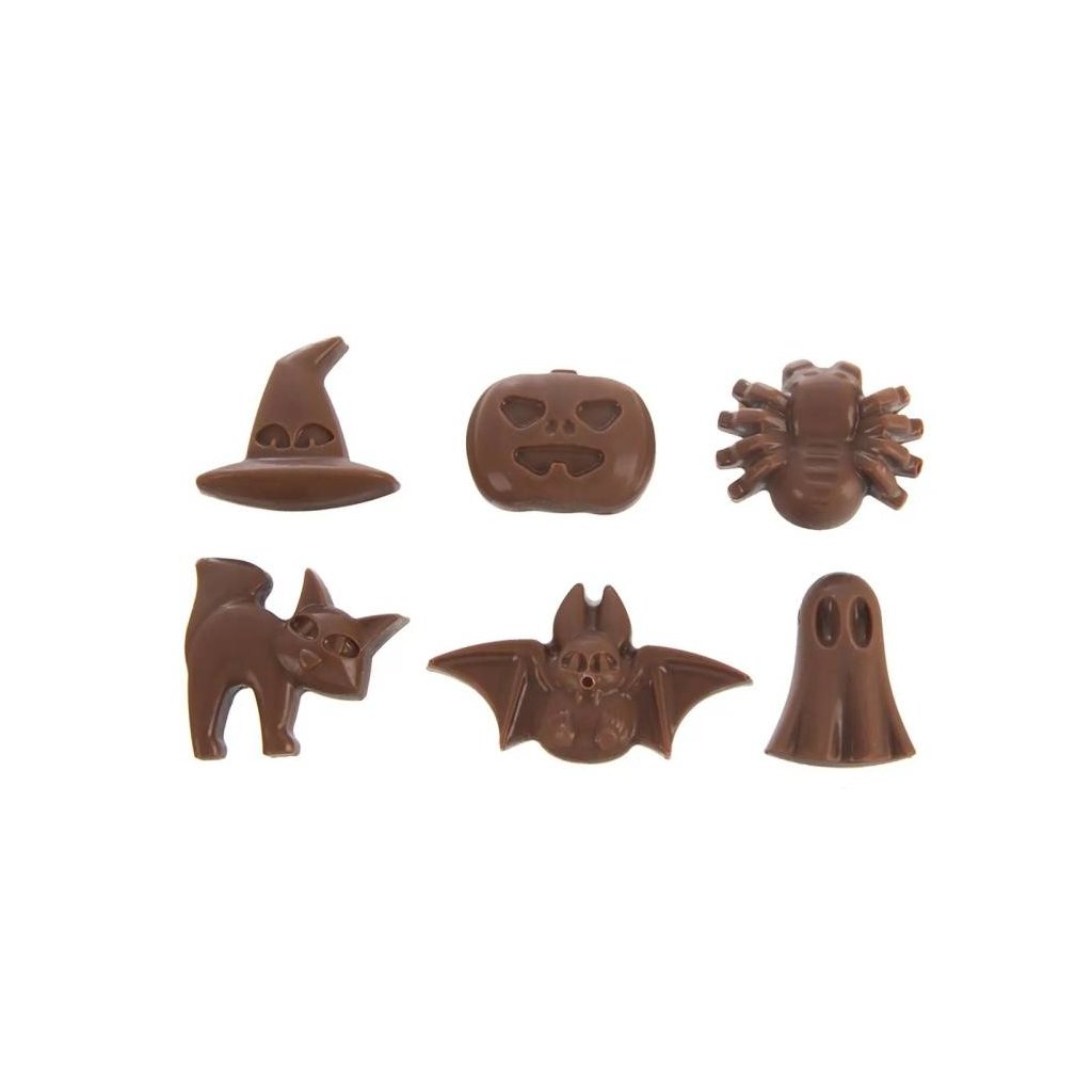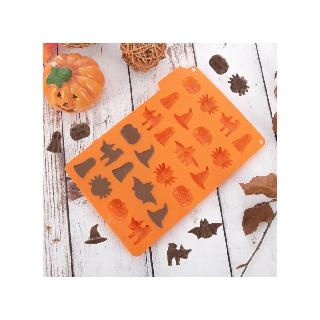 Silikonová forma Vám vytvoří dobroty z čokolády nebo želé na Halloween – klobouk, dýně, pavouk, kocour, duch, netopýr. Materiál: silikon ( teplotní odolnost od -40°C do +220°C) Rozměr formy: 27 x 19 x 1,5 cm Rozměry tvarů: 3 - 5,5 cmDoplňkové parametry