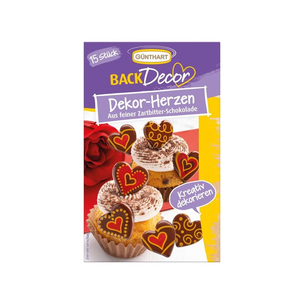 Čokoládové dekorace srdce. V balení 15 ksDodejte svým pečicím výtvorům láskyplný a elegantní nádech s dekorativními srdíčky Günthart BackDecor z jemné hořké čokolády. Tato krásná srdíčka jsou ideální pro kreativní zdobení dortů, cupcaků a zákusků. V jedné prodejní jednotce najdete celkem 15 srdíček, která jsou zdobena atraktivním vzorem v červené a zlaté barvě. Každé srdce je samo o sobě malým uměleckým dílem a udělá z vašeho pečiva opravdový poutač. Tato dekorativní srdíčka vyrobená z vysoce kvalitní hořké čokolády nabízejí nejen dekorativní, ale i lahodný doplněk vašich sladkých výtvorů. Ušlechtilá chuť čokolády svede vaše smysly a potěší vaše hosty. Ať už na Valentýna, narozeniny, výročí nebo jednoduše jako láskyplný dárek – dekorativní srdce Günthart BackDecor jsou všestranná a dodají vašemu slavnostnímu stolu zvláštní akcenty. Ponořte se do světa kreativního zdobení na pečení a vykouzlete úsměv na tvářích svých blízkých s dekorativními srdíčky Günthart BackDecor. Udělejte z každé příležitosti zvláštní a nezapomenutelný okamžik. Kakao: minimálně 62%