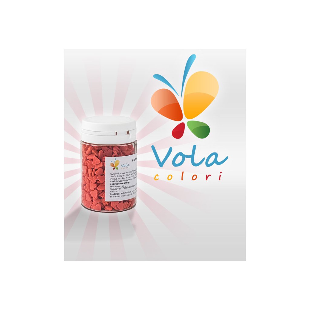 Cukrový posyp ve tvaru červených srdíček. Vhodný na zdobení dortů, dezertů, zákusků v cukrářské a zmrzlinářské výrobě.