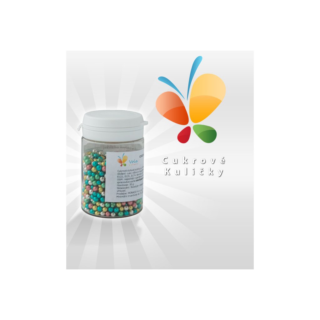 Cukrové kuličky, prům. 3-4mm (duhové metalické) 50 g/dóza