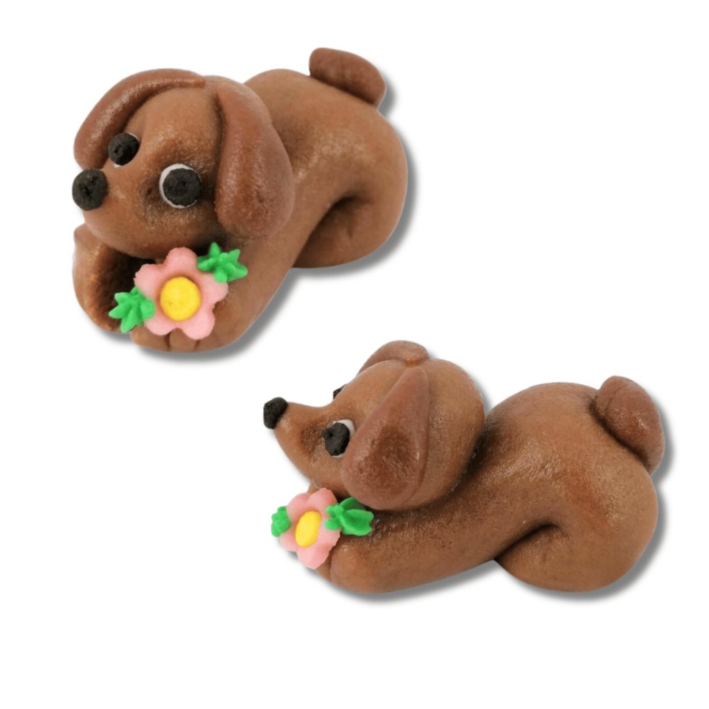 Marcipánová ozdoba - ležící pejsek s kytičkou 1 ks Ozdoba na dort s pejskem