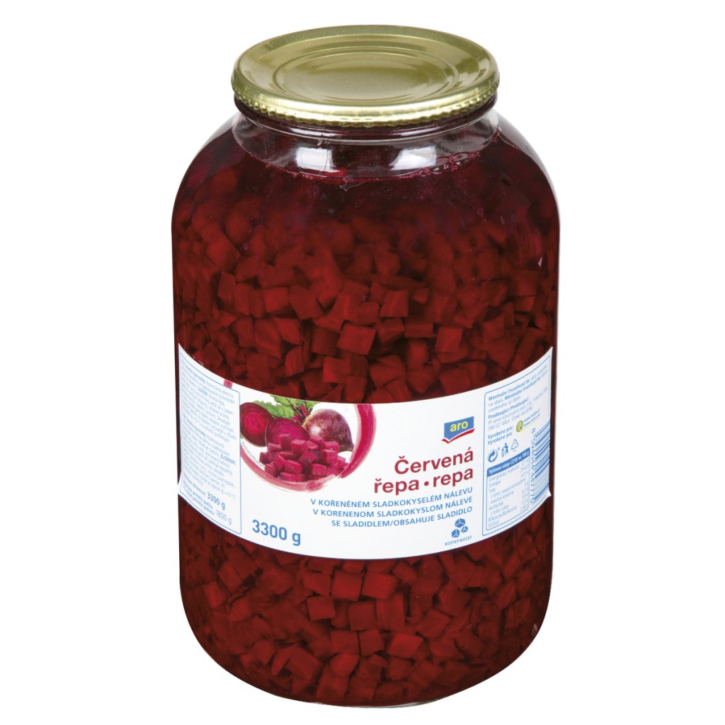 - ARO Červená řepa kostky. Zpracovaná zelenina jednodruhová, dělená, sterilovaná ve sladkokyselém kořeněném nálevu se sladidlem.