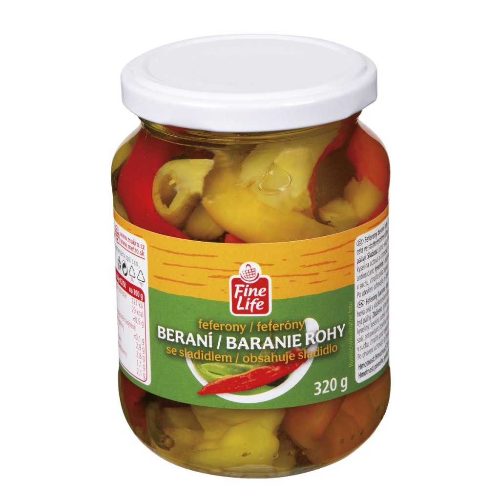 - Feferony, pitná voda, jedlá sůl, kyseliny: kyselina octová a citronová; sladidlo: sacharin a jeho sodné soli; antioxidant: kyselina L-askorbová; barvivo: riboflaviny.