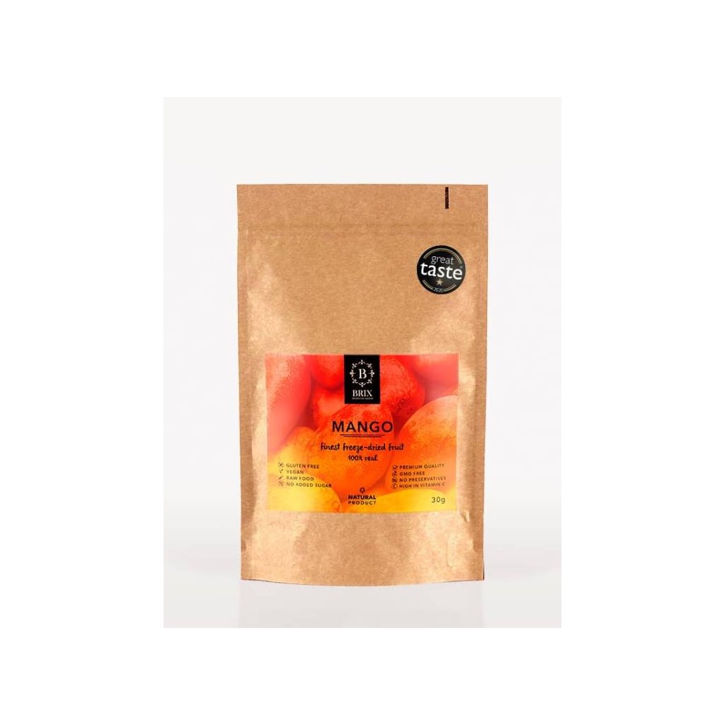 Ovoce sušené mrazem je 100% čisté ovoce, ze kterého je odstraněna voda. Je křupavě vysušeno, zachovává si barvu, chuť a až 98% výživových hodnot, takže je téměř identické s původním ovocem. Je bez konzervantů. Může být rehydrováno nebo konzumováno přímo. Ideální do müsli, jogurtů, sorbetů, smoothies, pro kulinářské speciality a pečení. Vyrobené z 300 g čerstvého ovovce.Složení, co obsahuje produkt - Brix Lyofilizované mango 30 g pro cukrářské účely: