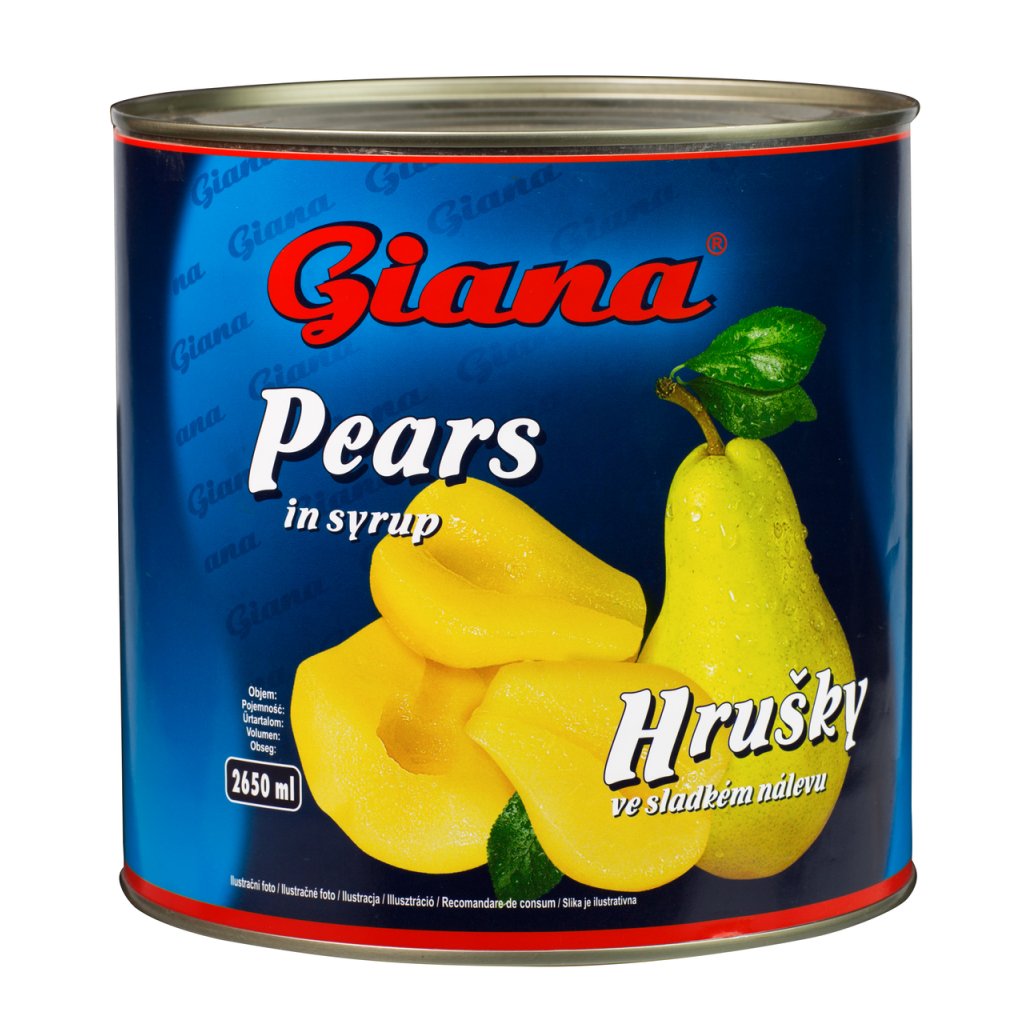 - Hrušky loupané půlené ve sladkém nálevu. Konzervované pasterované jednodruhové ovoce s nálevem