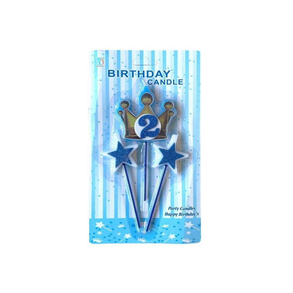 Svíčky koruna zlato-modrá s číslem 2 a hvězdičky modré ▹