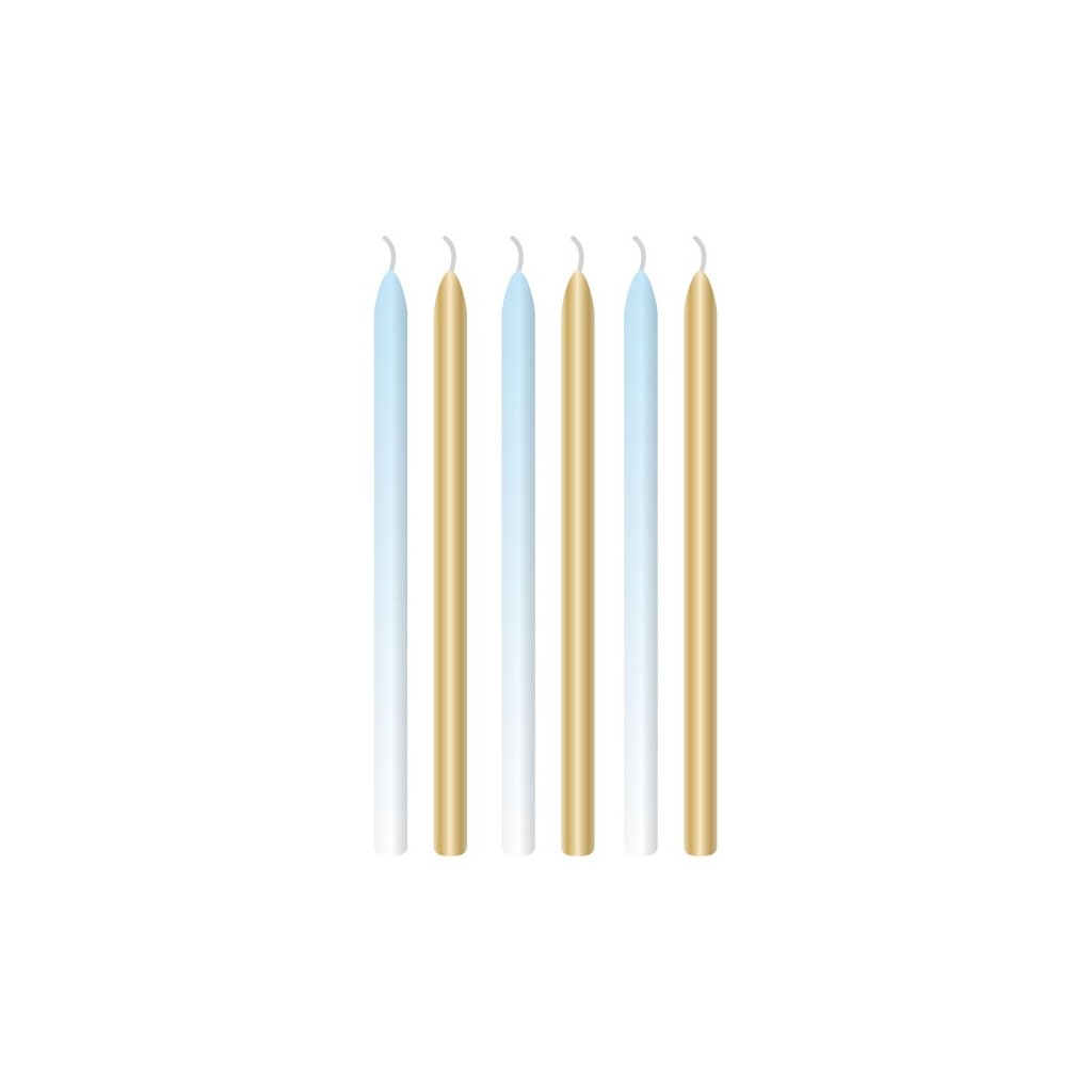 Dortové svíčky vhodné k ozdobení dortu nebo cupcaku. Svíčky Ombre modrá a zlatá barva. Rozměr: 12 cm. Balení: 6 ks.Doplňkové parametry