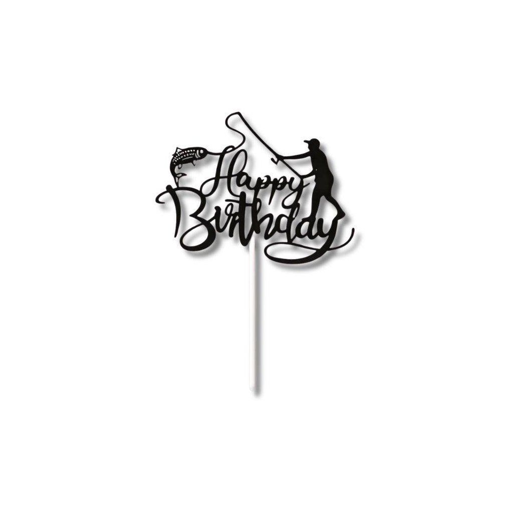 Dekorativní zápich na dort s motivem rybáře a nápisem „Happy Birthday“ je ideální volbou pro milovníky rybaření a tematické oslavy. Siluetový design působí moderně a zároveň dodává dortu osobitý charakter.