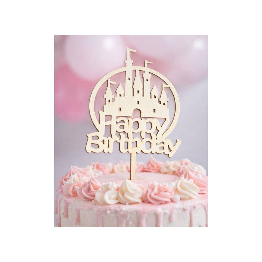 Zápich do dortu dřevěný Happy Birthday s hradem ▹