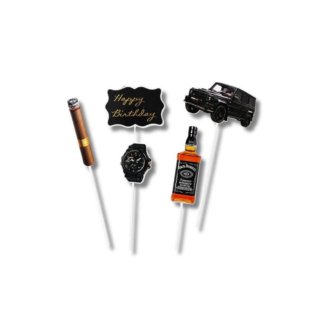 Sada zápichů do dortu „Gentleman party“ je perfektní volbou pro stylové a tematické oslavy. Kombinace motivů jako luxusní auto, láhev whisky, hodinky a doutník dodá dortu výrazný a originální charakter.
