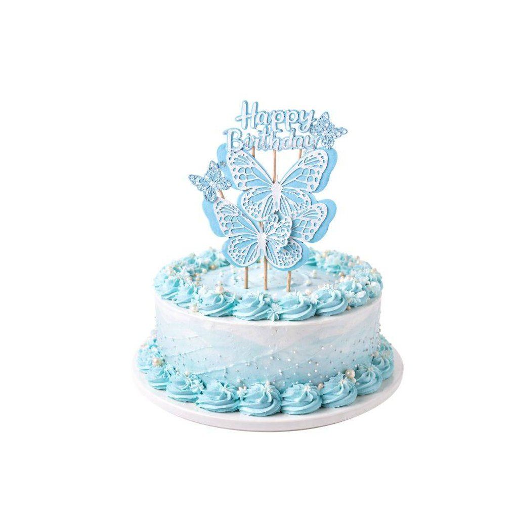 Modrý zápich na dort s motýly a nápisem Happy Birthday je elegantní dekorace, která promění každý dort ve stylový a slavnostní dezert.