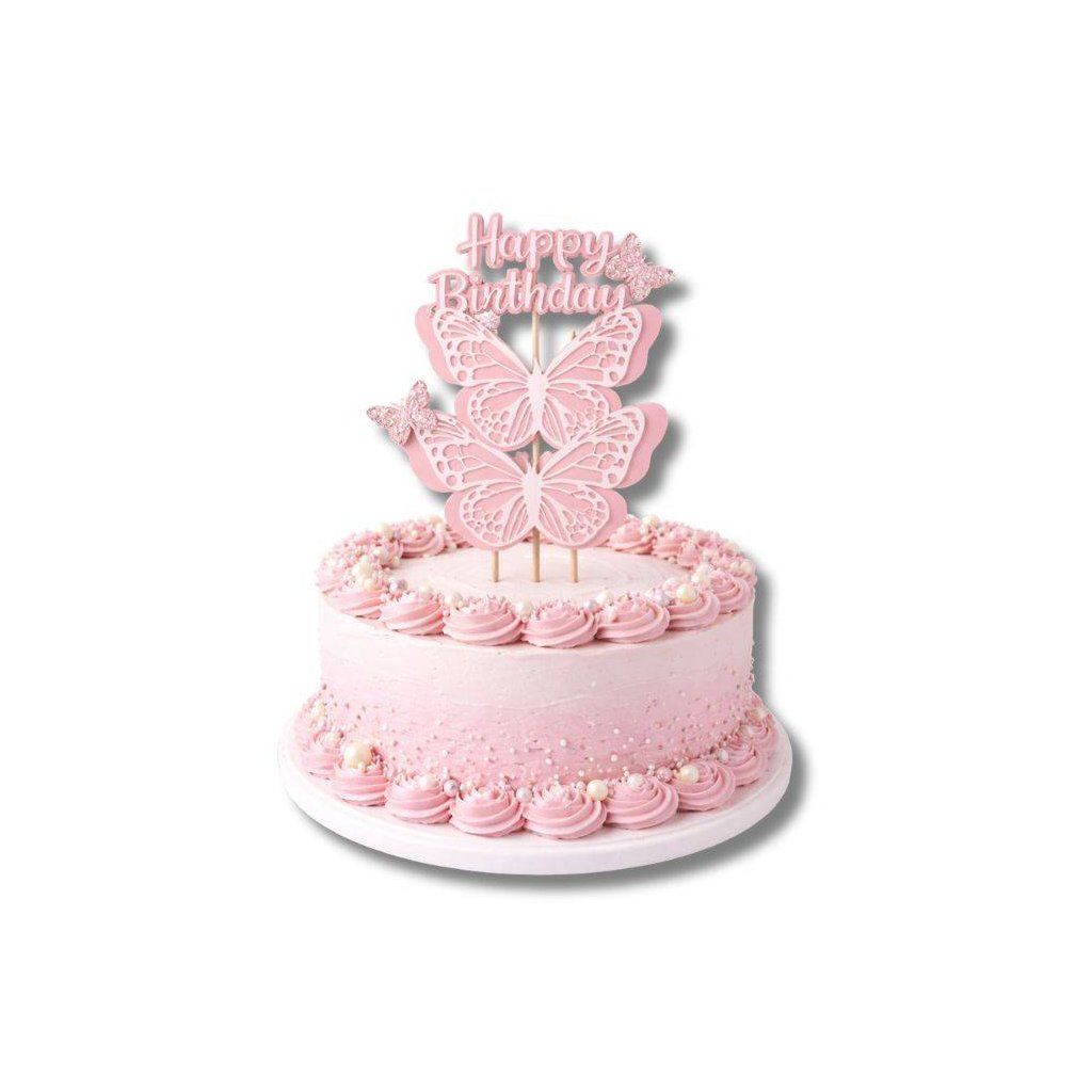 Růžový zápich na dort s motýly a nápisem Happy Birthday je elegantní dekorace, která promění každý dort ve stylový a slavnostní dezert.