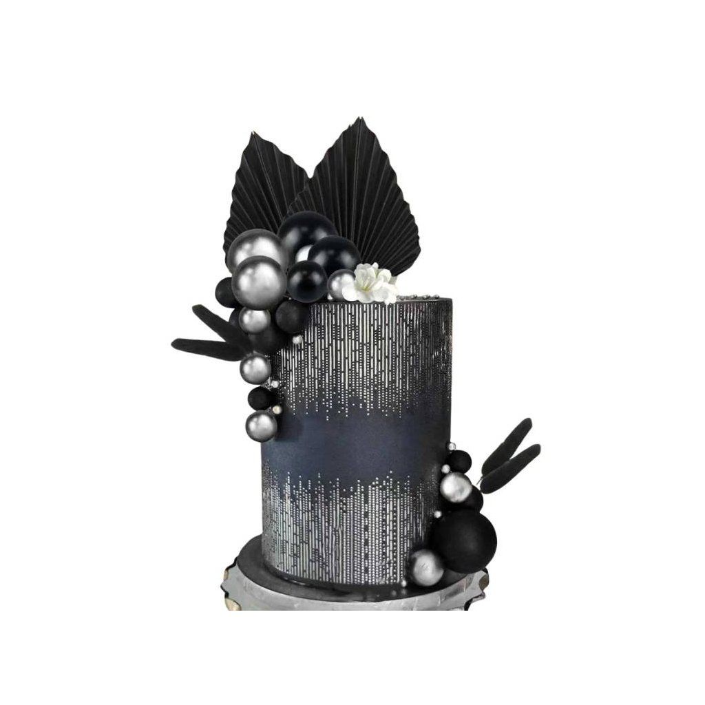 Zápich do dortu Koule, květiny a chmýří černé a stříbrné různé velikosti (28 ks) ▹