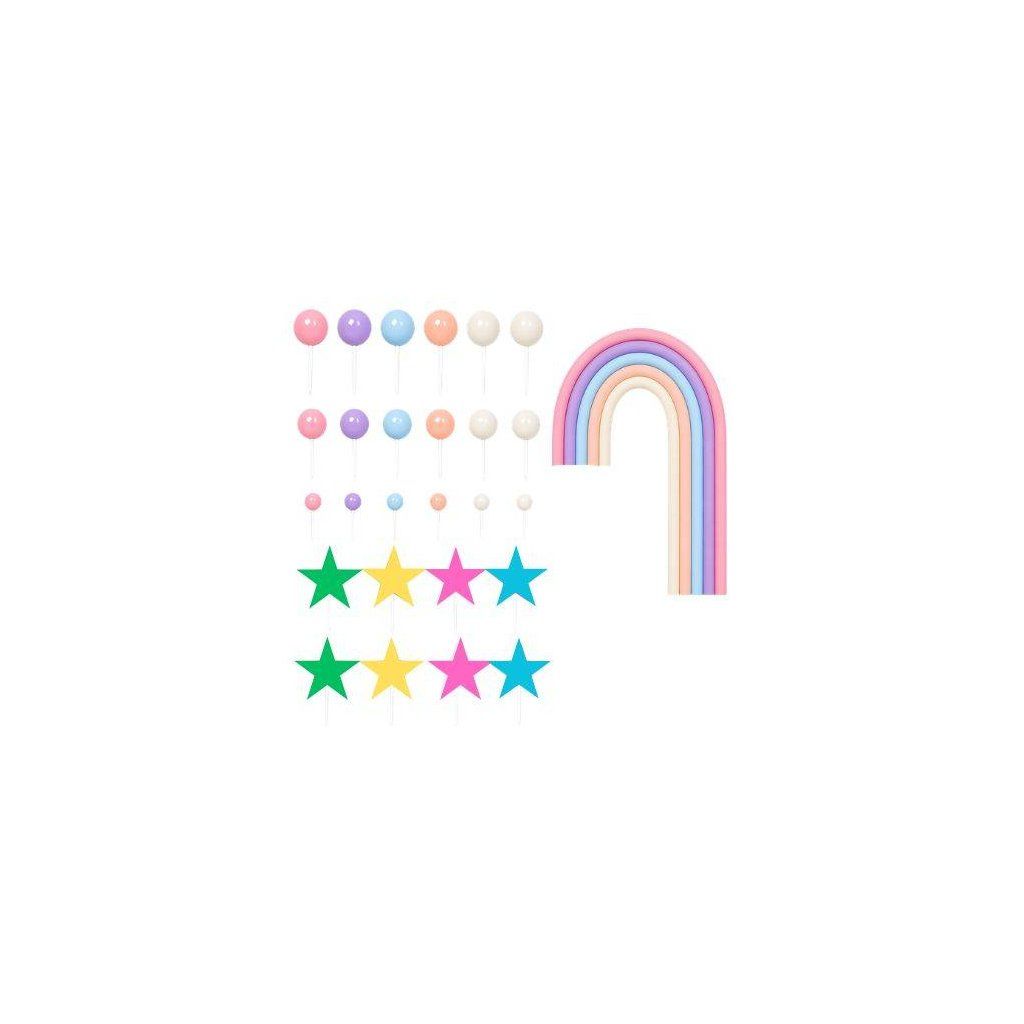 Vytvořte během chvilky krásně ozdobený dort s tímto dekorativním zápichem s motivem duhy, hvězd a barevných koulí. Kombinace jemných i výrazných barev dodá dortu hravý a moderní vzhled, který se skvěle hodí na narozeninové oslavy, baby shower nebo tematické párty.