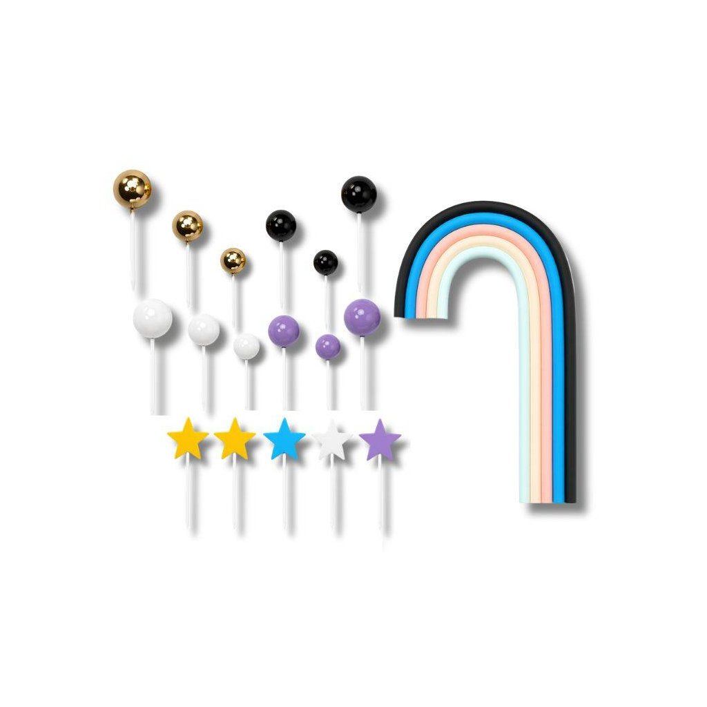 Vytvořte během chvilky krásně ozdobený dort s tímto dekorativním zápichem s motivem duhy, hvězd a barevných koulí. Kombinace jemných i výrazných barev dodá dortu hravý a moderní vzhled, který se skvěle hodí na narozeninové oslavy, baby shower nebo tematické párty.