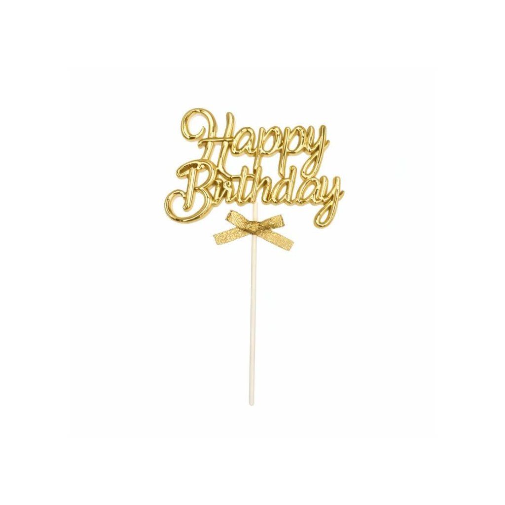 Zápich do dortu zlatý Happy Birthday s mašličkou ▹