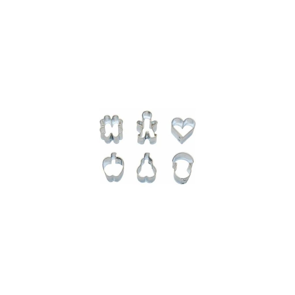 Sada 6ti mini vykrajovátek (hříbek, panáček, srdce, čtyřlístek, hruška, jablko) z pocínovaného plechu.Doplňkové parametry