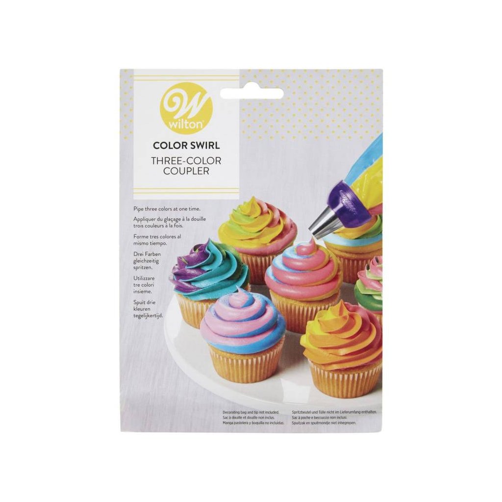 Nástavec na zdobení třemi druhy krému. Adaptéry vložte do tří zdobících sáčků a naplňte krémy různých barev. Poté je spojte dohromady, nasaďte na ně trezírovací špičku a zašroubujte závitem.Doplňkové parametry
